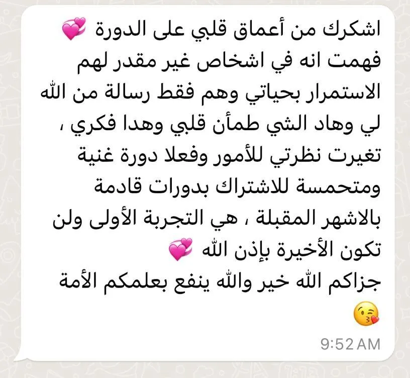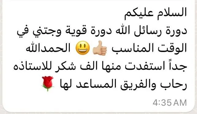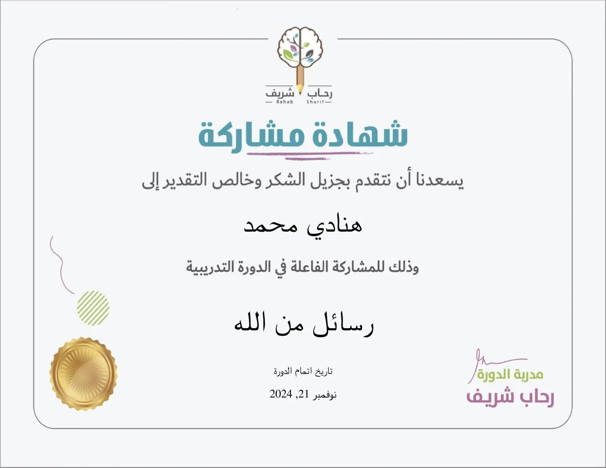 عند الانتهاء من الدورة التدريبية الكاملة، ستحصل على شهادة من .....، تبين اكتمالك لدورة رسائل من الله.